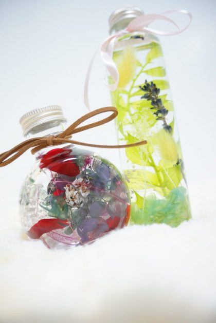写真のお花は『ハーバリウム』ハーバリウムは、特殊な液体の中に植物を閉じ込め、長く鑑賞することができる魅惑のインテリア🌹お花はブリザードフラワーを使っています💕