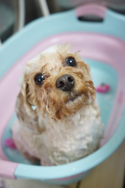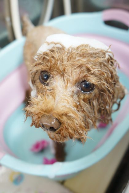 ジルちゃん💗ローズシャンプー中〜🌹のいい香りで、ふわふわな仕上がりです🎵これからは虫よけ効果もあり💕